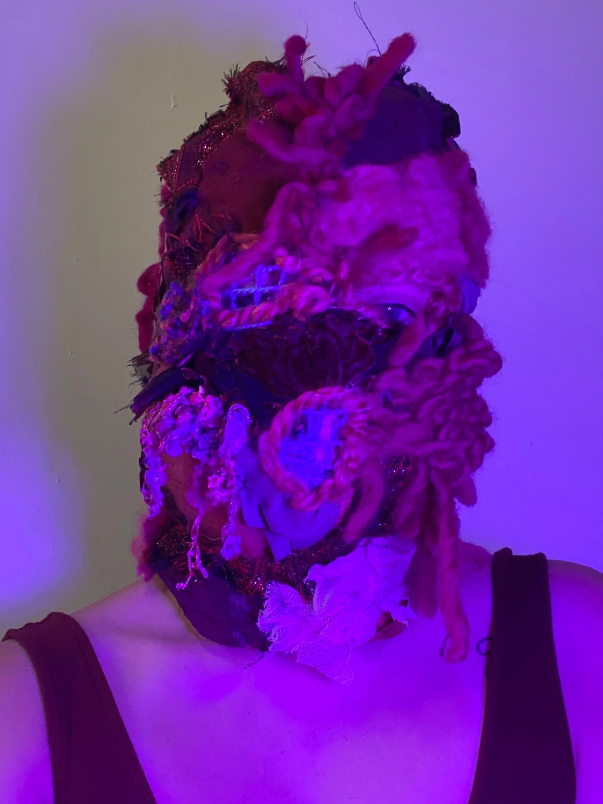 Using the balaclava mask fetishized by internet culture and worn by girls to sexualize their personas, they are collaged into fleshy, grotesque figures through scraps from materials used in other projects.